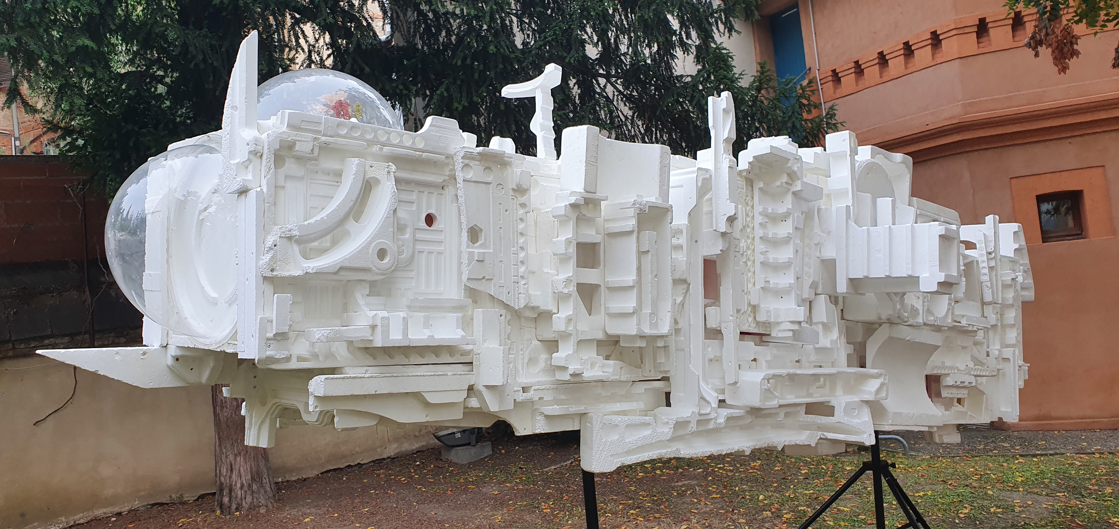 La sculpture attend sa prochaine métamorphose, elle sera recouverte de résine et de fibre, tel un cocon, avant d'éclore de nouvelles images mappées pour les futures représentations...