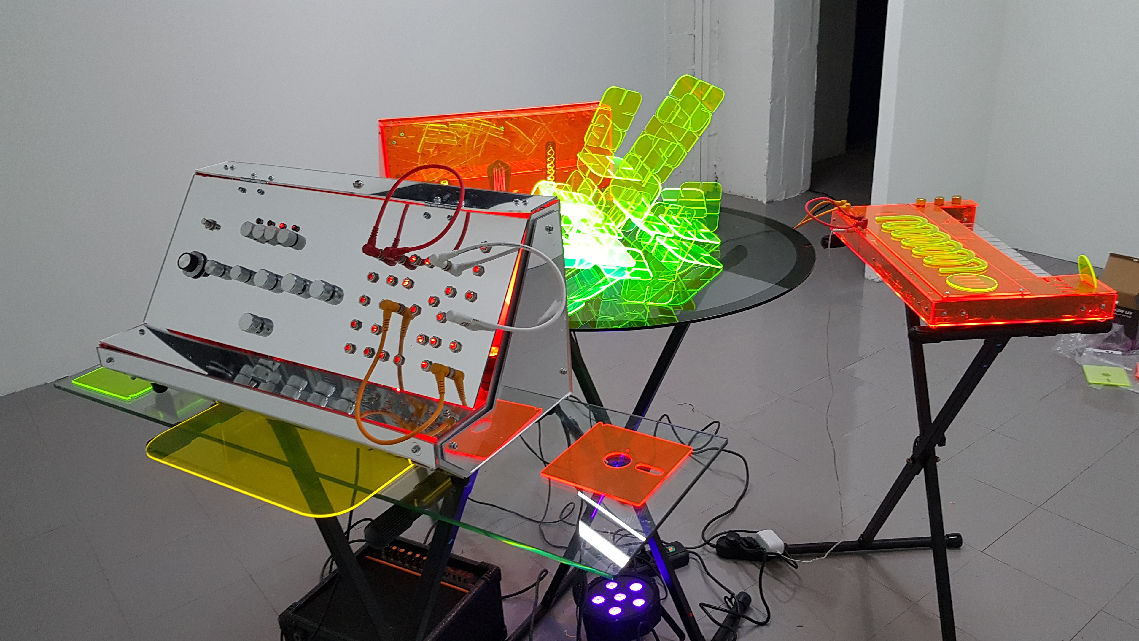 "... je fais ce que je m'imaginais il y a 30 ans. A quoi pouvait bien ressembler l'art et le monde d'aujourd’hui, une sorte de rétro futurisme à l'envers. L'an 2000 est passé par là, une date pas seulement symbolique et qui a généré en moi une frustration positive..." extrait de ma bio imaginaire Comment je rêvais l'Art en 2020, il y a 30 ans ? Cette série de pièces réalisées en 2018 sont avant tout des sculptures présentées dans un dispositif scénique. Certains volumes sont sonores et peuvent s’apparenter aussi à du mobilier design et lumineux. Elles reprennent les formes et respectent les dimensions à l’échelle de synthétiseurs cultes comme le MS 20 de chez Korg ou le SH 101 de chez Roland. Le MS DS est une réplique formel du MS 20 tout en miroir et sans touches et son modèle est une référence dans l’Histoire de la musique. J’ai conservé, dans son anatomie extérieure, les perforations des prises jack pour disposer des câbles audios colorés, une touche picturale et chromatique qui s’apparente à la peinture. On peut y en jouer, faire de la musique grâce à son séquenceur, ces oscillateurs et filtres d’un circuit électronique intégré. Ce dernier est un DIY acheté sur Internet et construit sois même ainsi que la réalisation de toutes les soudures. Dans ce processus je met en avant la DIY et Drone culture qui reflète avant tout une volonté de marquer une indépendance et de concevoir des pièces uniques. Les finitions des sculptures ou les visses apparentes s’opposent à la fabrication manufacturée en série et s’appuient sur ma volonté d’utiliser des objets de la culture électronique et de m’interroger sur les orientations et les décisions de produire des diktats inoxydables. Le choix de l’utilisation du PMMA et du plexiglas dans la plupart des mes productions et créations sont d’ordre économique (bien que je m’interroge sur l’utilisation du plastique dans mes recherches sur l’anthropocène). Dans l’absolu c’est le verre qui m’intéresse, une matière plus noble et résistante au temps dans sa colorimétrie. Le vitrail ou le soufflage de verre pourraient être une nouvelle voie futur plus conséquente dans la conception de mes sculptures. GT8 est translucide et on y aperçoit trois ampoules à incandescence (cf: les néons gélatinés ou contre-consommation du tout LED) aux formes vintages qui rappellent des lampes ou tubes à vide des amplificateurs sonore. Sur la façade un dessin sérigraphié reprend l’emplacement des potentiomètres et des perforation du MS 20, au lieu de chiffres et autres indicateurs des sections originales, des noms de formations musicales, des prénoms de producteur, de villes ou de styles musicaux depuis la musique concrète illustrent le panneau comme un organigramme imagé de l’Histoire de la musique électronique. Tandis que le SH Magnétique reprend la forme du SH 101 ouvert comme un piano à queue et rempli de bandes magnétique de K7 audio. Ces trois «claviers» posés sur des pieds en X sont disposés autour d’une table circulaire en verre transparente sur laquelle une sculpture modulaire est en étreinte et s’irradie de lumière noire. Les sculptures se laissent ainsi aller autant dans l’obscurité qu’en pleine lumière et attendent qu’une seule chose: qu’un spectateur tourne autour d’elles et s’en approche, s’en saisissent le plus spirituel qu’il soit..
